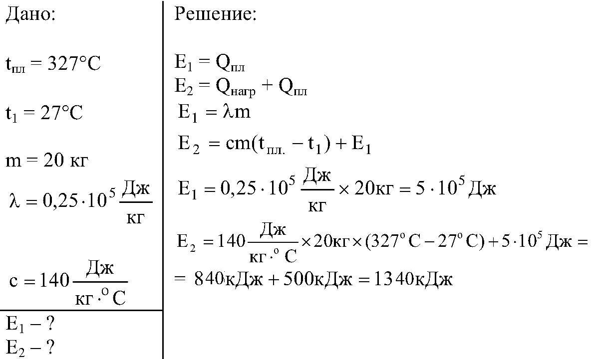 2) сколько энергии требуется затратить чтобы расплавить свинец массой 20 кг при температуре плавления? сколько энергии понадобится для этого если начальная температура свинца 27° С?