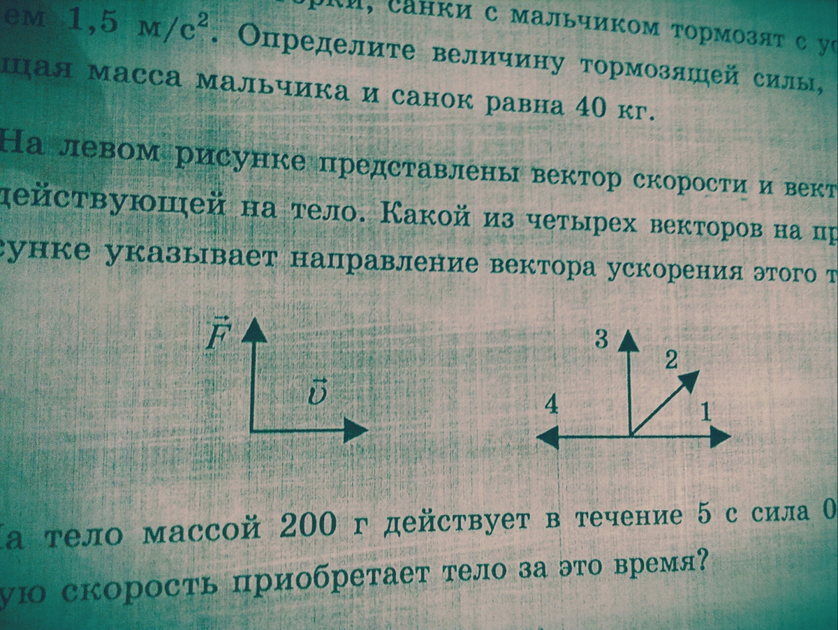 на левом рисунке представлены вектор скорости и вектор силы, действующей на тело. Какой из четырех векторов на правом рисунке указывает направление вектора ускорения этого тела?