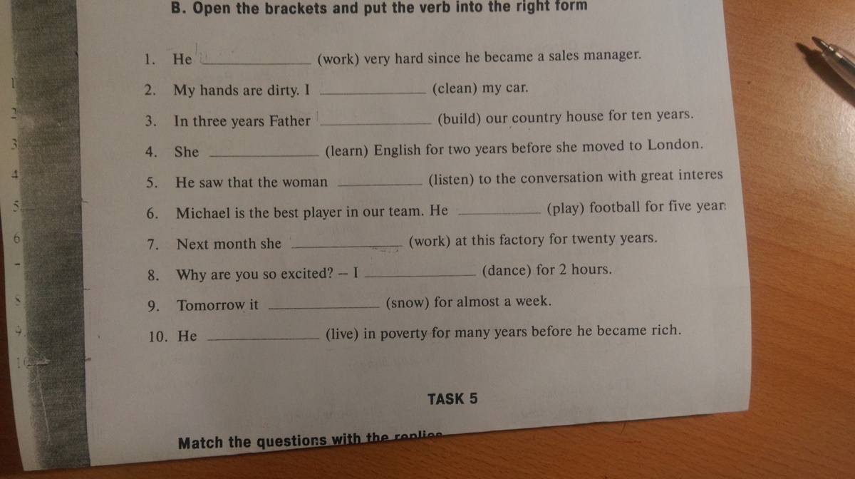 Works,cleaned,was building ,plays,works,was dancing,was living