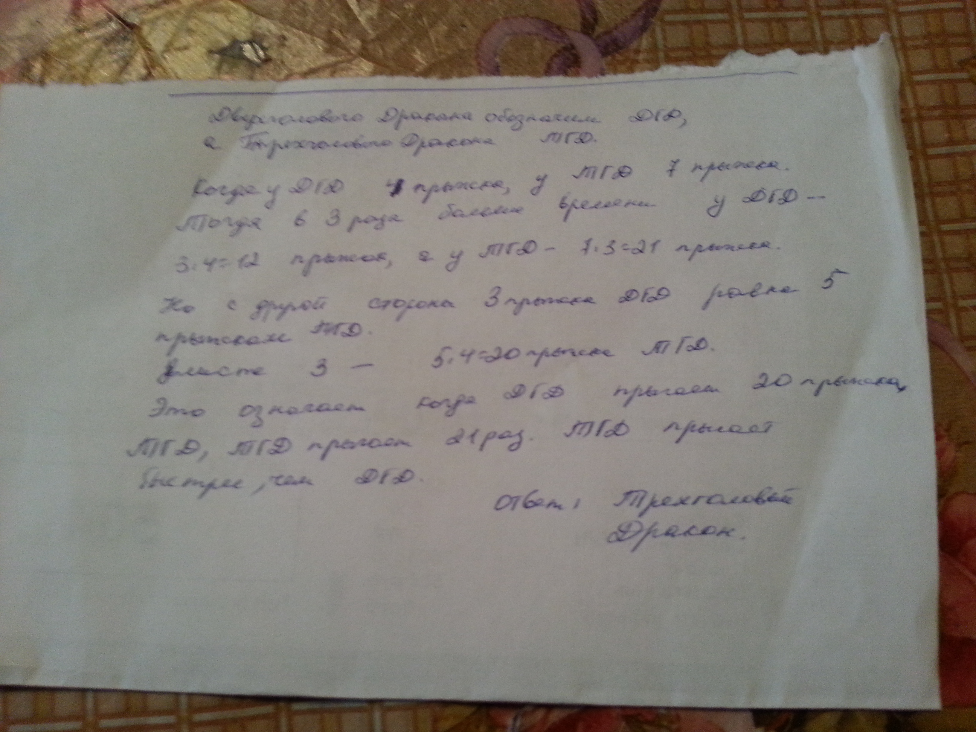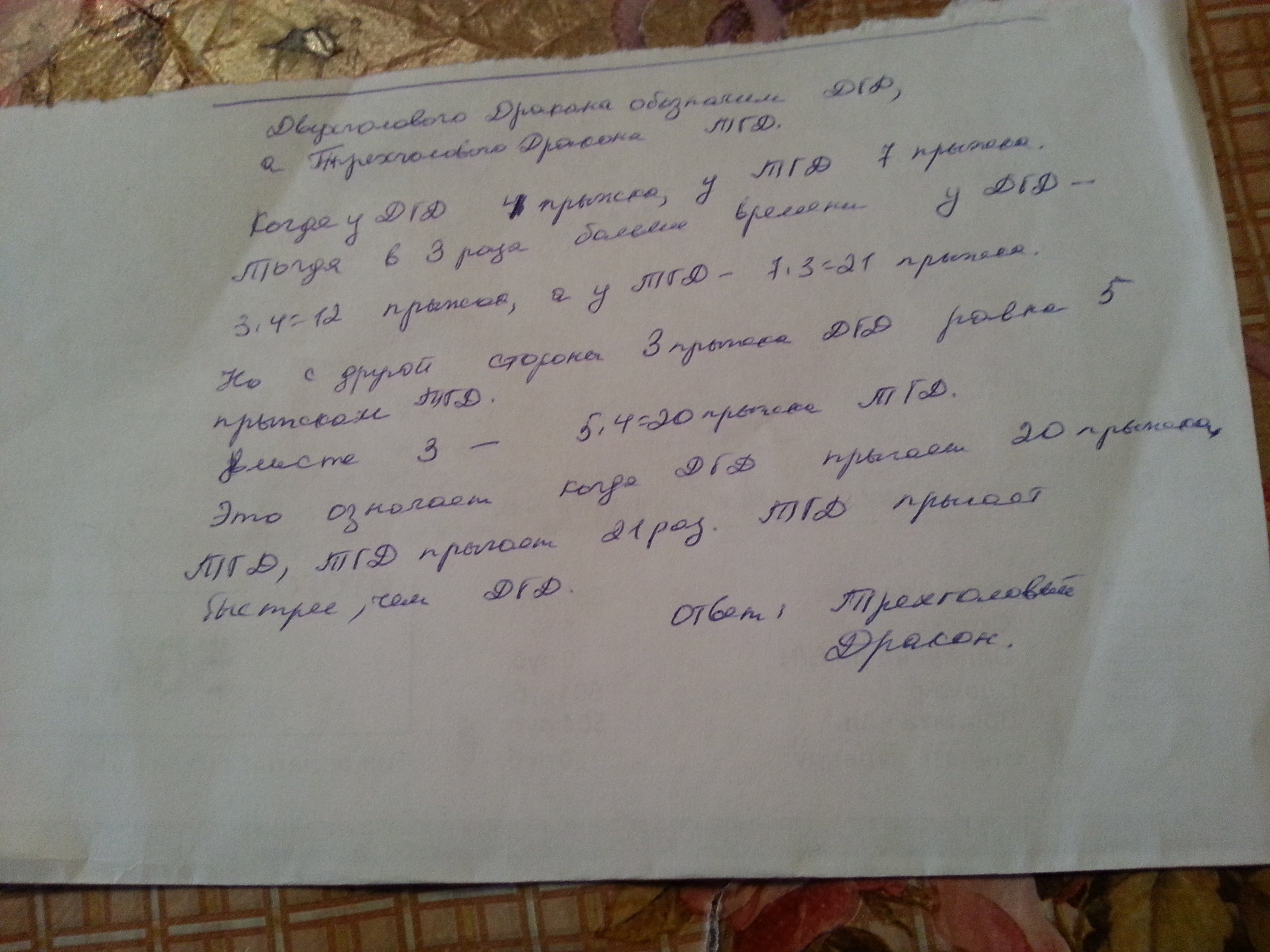 Три прыжка двуголового дракона равны 5 прыжкам трехголового. Но за то время , когда двуголовый дракон делает 4 прыжка, трехголовый делает 7 прыжков. кто из них быстрее? Ответ обоснуйте
