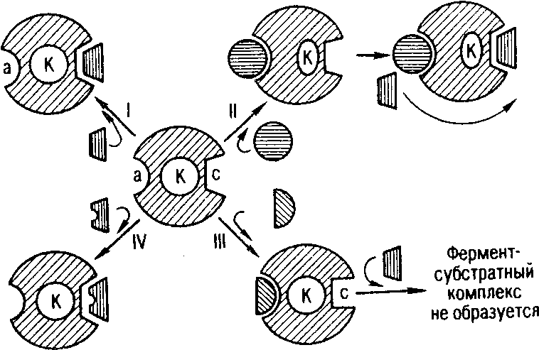 Рис 1. Схема активирования и ингибирования действия фермента (по Ю. Б. Филипповичу): а. – аллостерический центр фермента; К - каталитический центр; с - субстратный центр