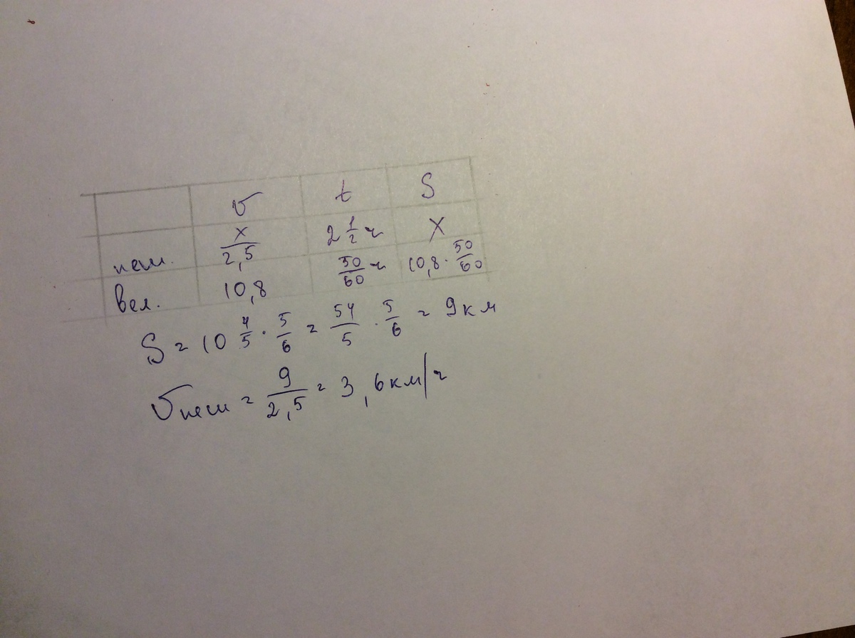 V пешехода = 9 км / 2,5 ч = 3,6 км/ч