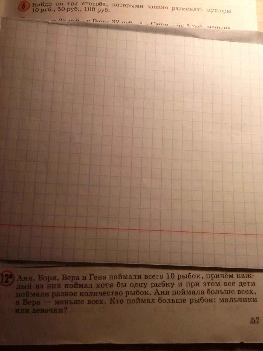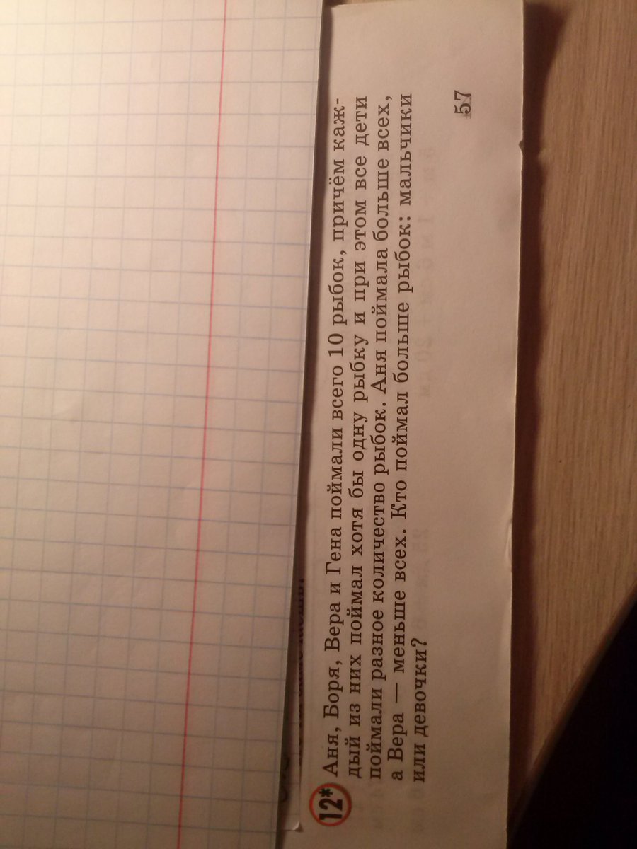 Чтобы все дети поймали больше одной рыбки, количество было разное и всего было десять. То поймали они 1,2,3,4. Так как одна девочка поймала больше всех, а вторая меньше всех, то в сумме они поймали 5, а мальчики тоже поймали в сумме пять. Тогда ответ никто