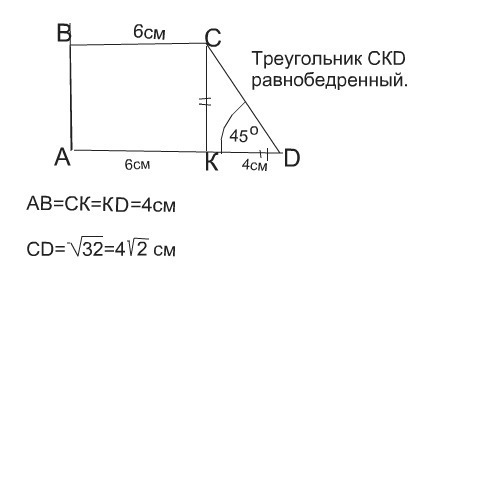 помогите с задачой по геометриий найдите меньшую боковую сторону прямоугольной трапеции основание которой ранвы 10 см и 6 см а один из углов равен 45 градусов только что бы было понятно