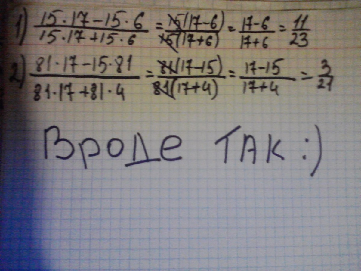 Сократите ДРОБИ 1)15*17-15*6 __________ 15*17+15*6 2)81*17-15*81 __________ 81*17+81*4 Плиииз и еще обьясните мне как вы решили.У меня просто не получилось на писать.Там вот так:15*17-15*6 а внизу по чертой 15*17+15*6.и со вторым точно также.