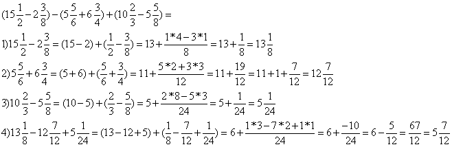 (15"целых" 1/2 - 2"целых" 3/8)-(5 "целых" 5/6 + 6 "целых" 3/4)+(10 "целых" 2/3 - 5 "целых" 5/8)=