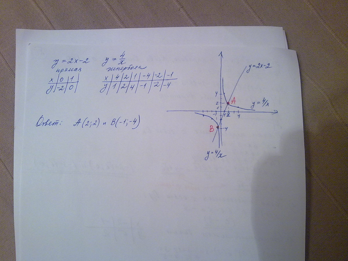 в одной координатной плоскости постройте графики заданных функций и найдите координаты их точек пересечения y=2x-2 и y=в числителе 4 в знаменателе х помогите!!!!