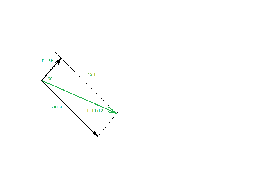 2 силы приложены к одной точке тела под углом 90 градусов друг к другу. Чему равен модуль равнодействующей силы,если F1=5, F2=15Н?