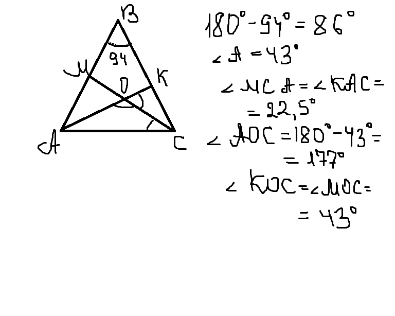 угол при вершине равнобедренного треугольника =94градусам,найти острый угол,образованный бесектрисами углов при основании треугольника