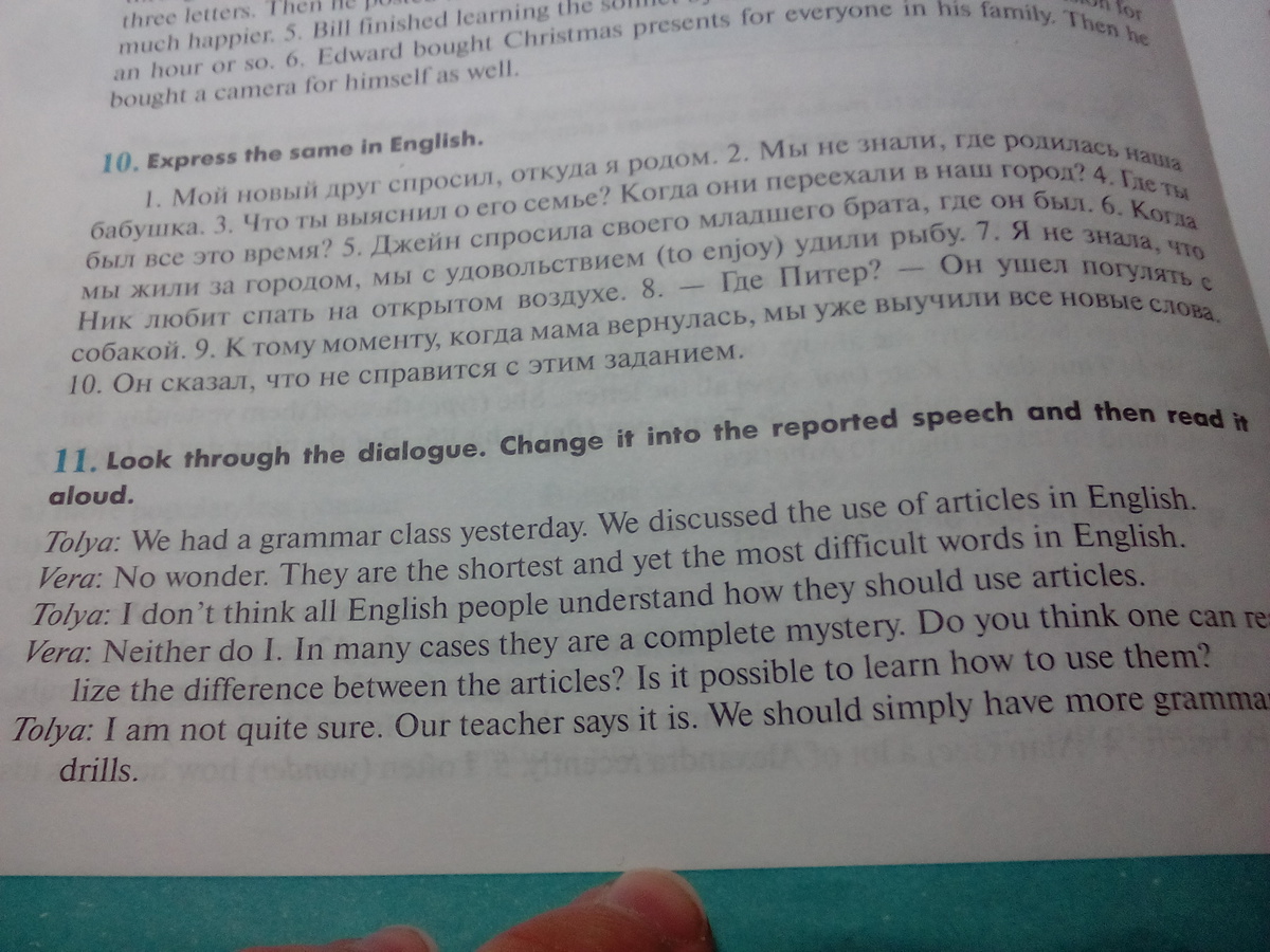 Tolya said he didn't think all English people understand how they had to use articles. Vera said that she thought so too. And she added that in many cases they were a complete mysteгy. Vera asked Tolya if he thought one could realize the difference between the articles. She wondered if it was possible to learn how to use them.