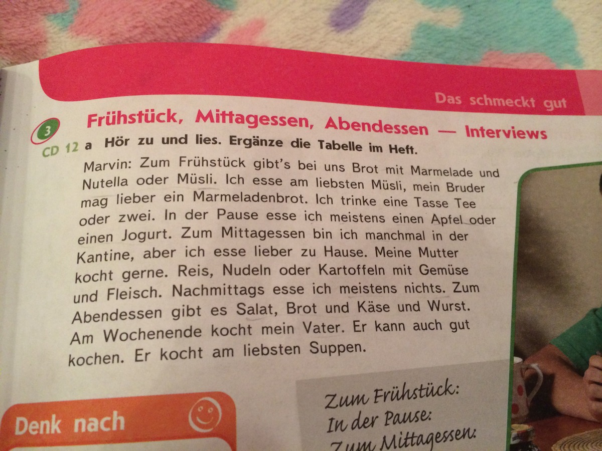 Марвин:На завтрак у нас хлеб с мармеладом и нутеллой или мюсли.Больше всего я люблю есть мюсли,мой брат отдаёт предпочтение хлебу с мармеладом.Я выпиваю чашку с чаем или две.В перерыве я съедаю чаще всего яблоко или йогурт.Обедаю я иногда в столовой,но всё же охотнее ем дома.Моя мама любит готовить.Рис,макароны или картофель с овощами и мясо.После обеда я чаще всего ничего не ем.На ужин- салат,хлеб и сыр,и колбаса.На выходных готовит мой отец.Он тоже умеет хорошо готовить.Больше всего он любит варить суп.