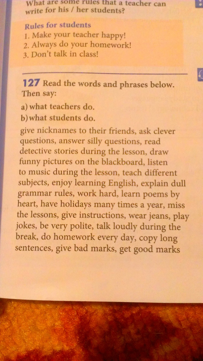 дают клички своим друзьям,задают умные вопросы,отвечают на глупые вопросы,читают детективные истории в течение урока,рисуют смешные картинки на доске,слушают музыку в течение урока,преподают различные уроки,любят учить английский,объясняют унылые грамматические правила,усердно стараются,учат поэмы искренне,имеют каникулы много раз в год,пропускают уроки,дают инструкции,носят джинсы,подшучивают,очень вежливы,говорят громко в течение перемены,делают домашнее задание каждый день,записывают длинные предложения,дают плохие оценки,получают хорошие оценки