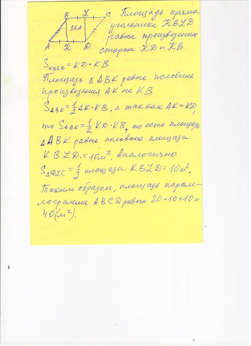 причем KBLD- прямоугольник с площадью 20 м2. Найдите площадь параллелограмма АВСD.