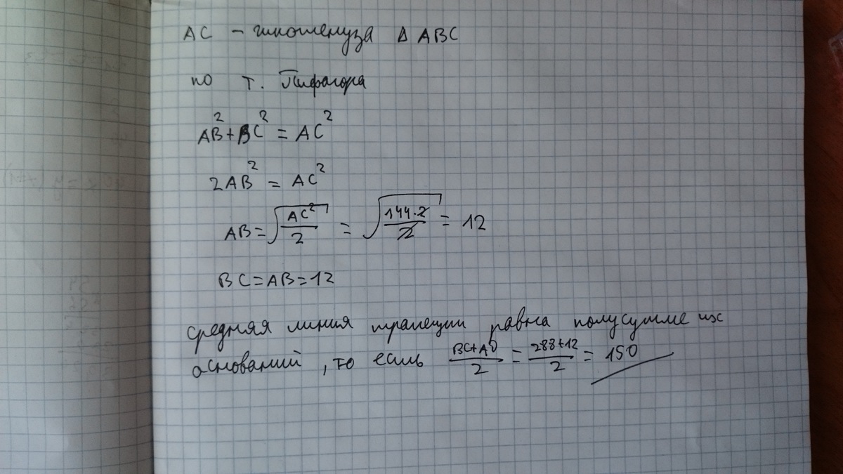 «диогональ АС трапеции АВСД угол В=90градусов делит её на два прямоугольных равнобедренных треугольника уголАСД=90 градусов.Найти среднюю линию трапеции если площадь треугольникаАСД=144 см в квадрате»