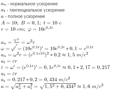 Диск радиусом 10 см вращается согласно уравнению φ=Ae^Bt, где A= 10 рад, B=0,1 c^-1. Определить полное ускорение точек лежащих на краю диска в конце 10-ой секунды?