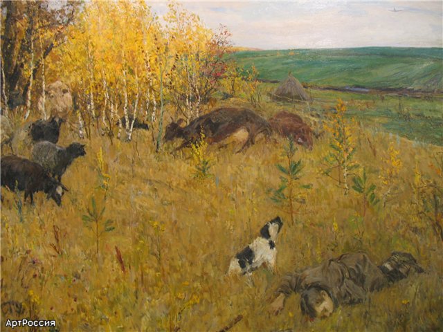 На фоне мирной родной природы особенно чудовищным и жестоким выглядит совершенное фашистами преступление. Пластов не случайно взял осенний мотив, который своей печальной красотой образно оттеняет трагическую гибель пастушка. Склон косогора художник написал похожим на драгоценный, переливающийся теплыми тонами ковер. Золото молодых березок, тут и там вспыхивающие красные пятна осенней листвы, зеленый бархат озими — все это воспринимается как красивое музыкальное сопровождение к печальной, нежной, лирической песне, полной глубокого внутреннего трагизма.