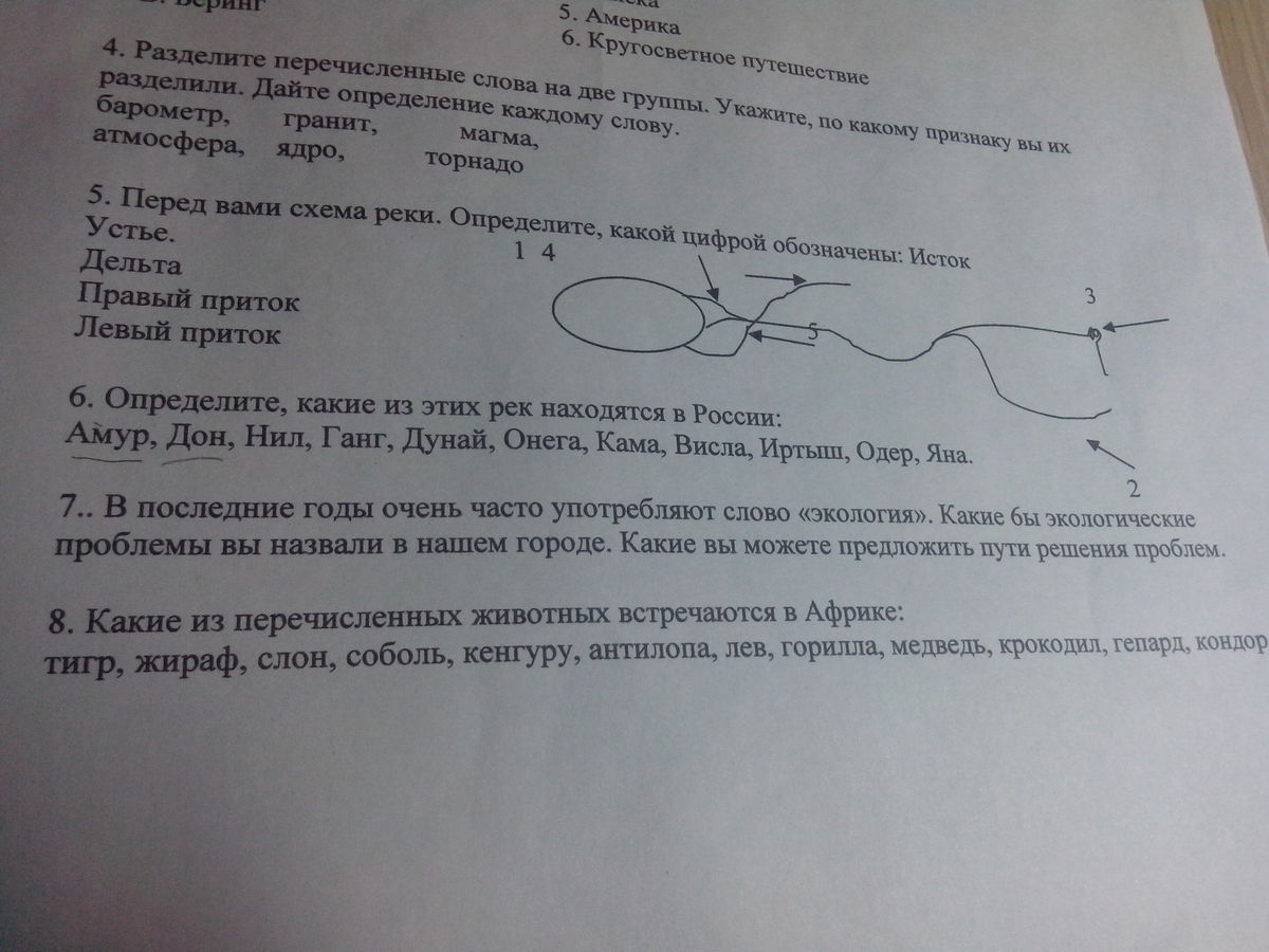 Ответ на вопрос 5: Дельта не знаю. Устье- это куда река впадает, правый приток, наверно 2, а левый - 3.