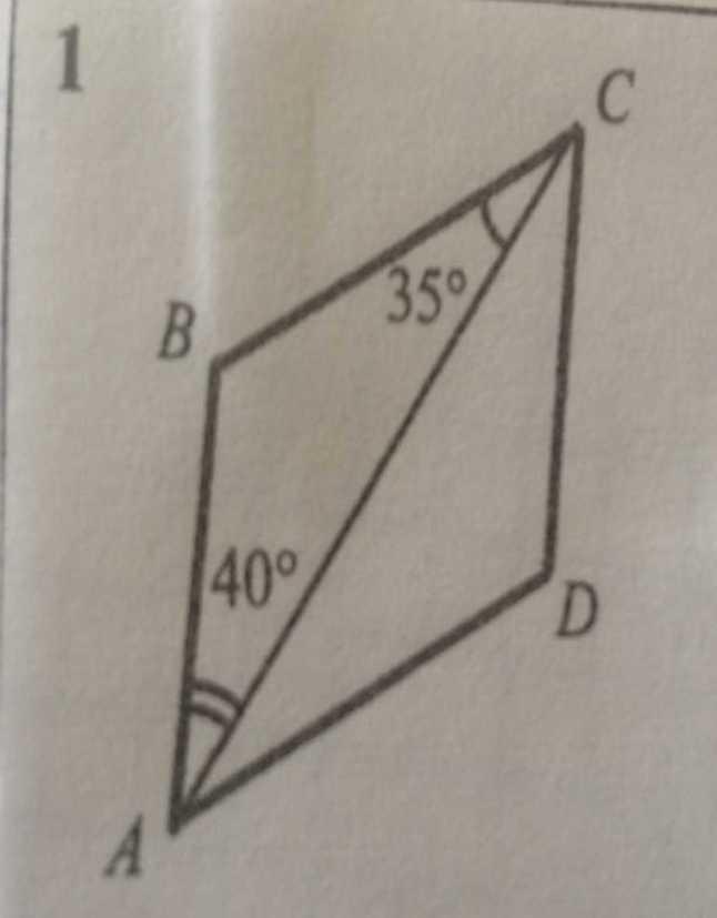 1) BC║AD, AC секущая, ⇒ <BCA = <CAD = 35° как внутренние накрест лежащие углы при параллельных прямых и секущей. ⇒ <BAD = <BAC +<CAD = 40° + 35° = 75°.