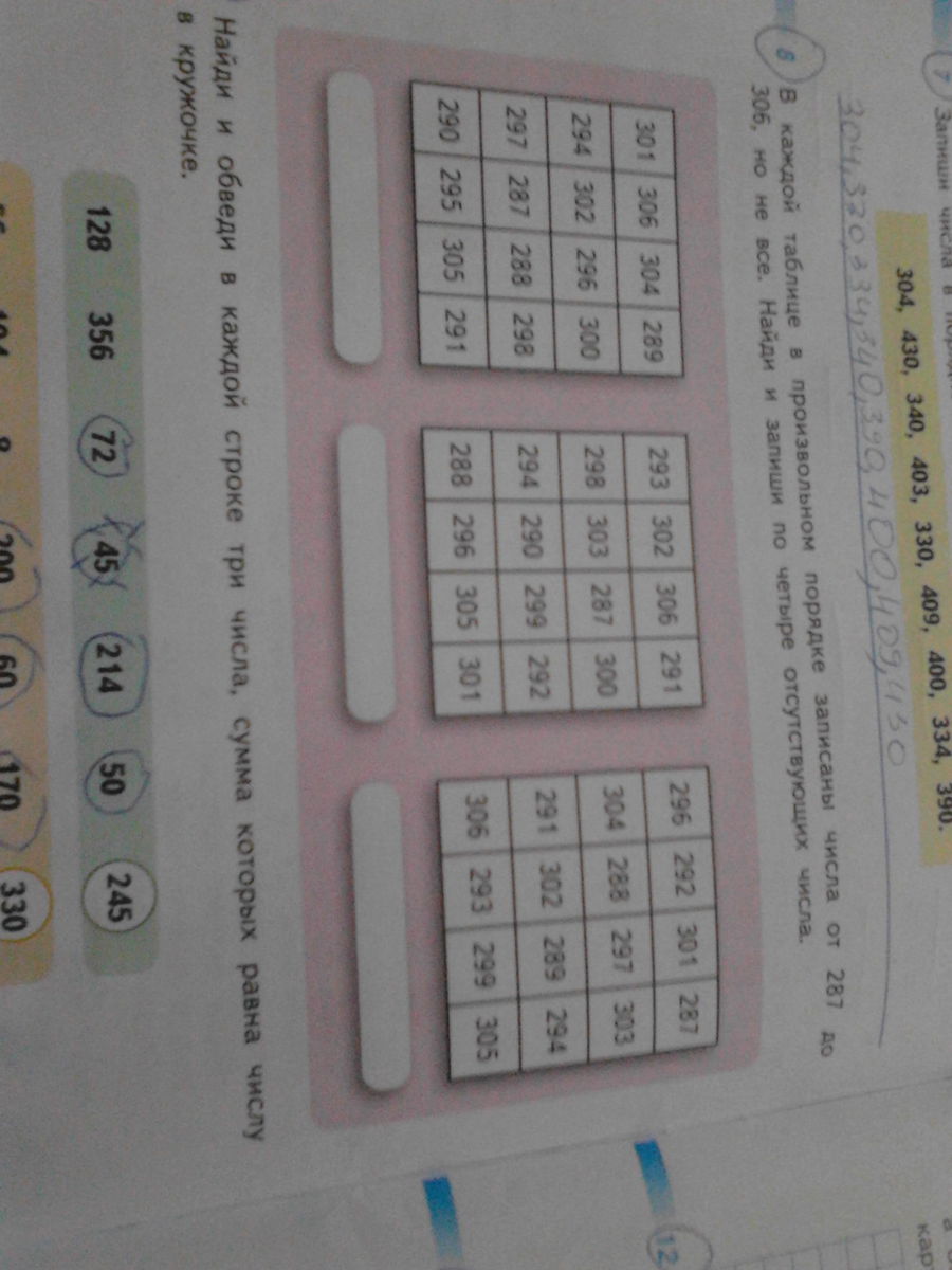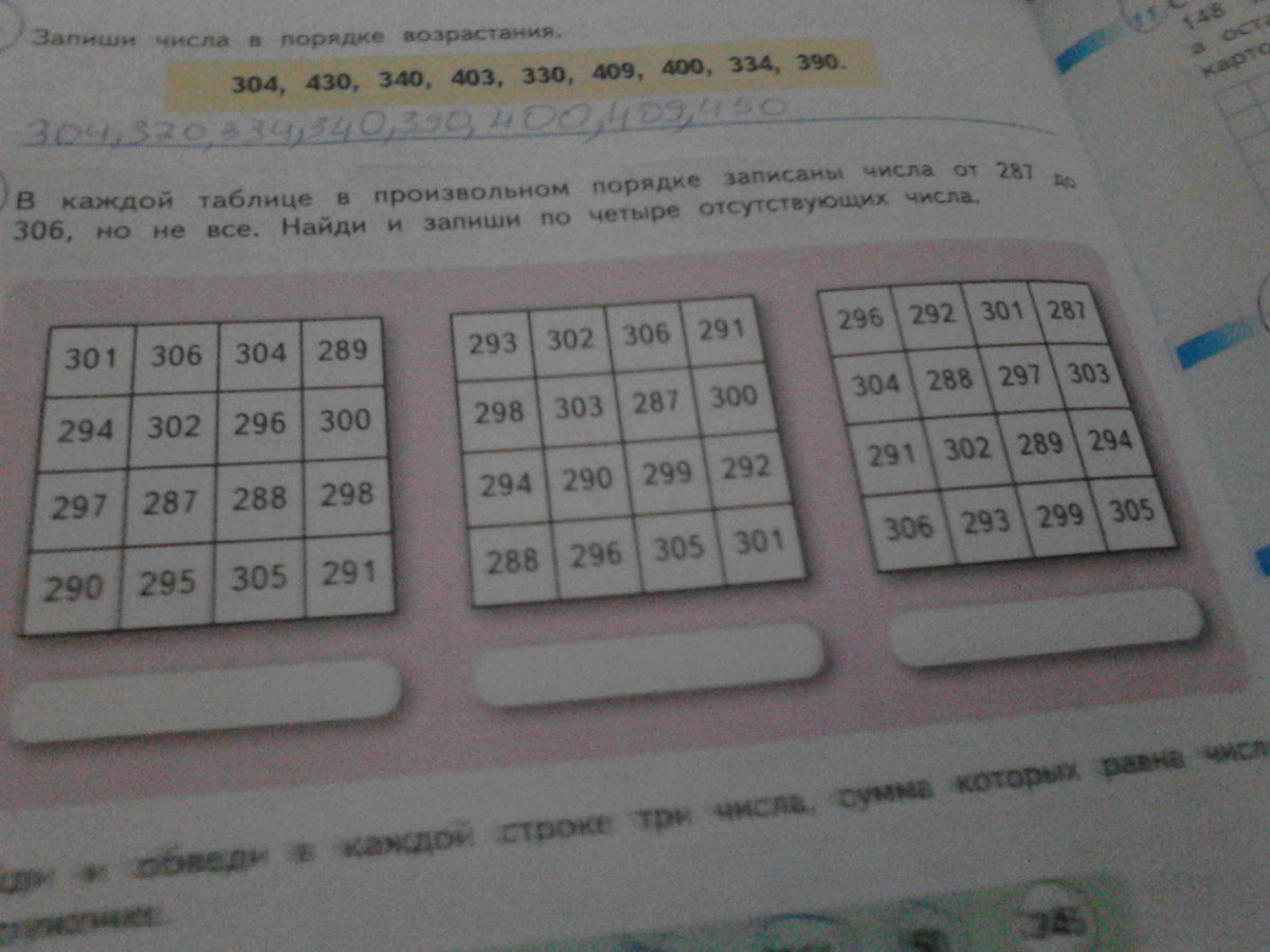 В каждой таблице в произвольном порядке записаны числа от 287 до 306,но не все.Найди и запиши по четыре отсутствующих числа.Помогите плис