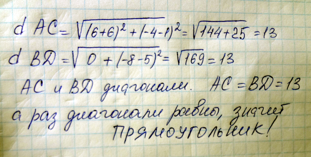 четырехугольник ABCD , А (-6; 1), В (0; 5), С(6;-4), D(0;-8) доказать что ABCD прямоугольник