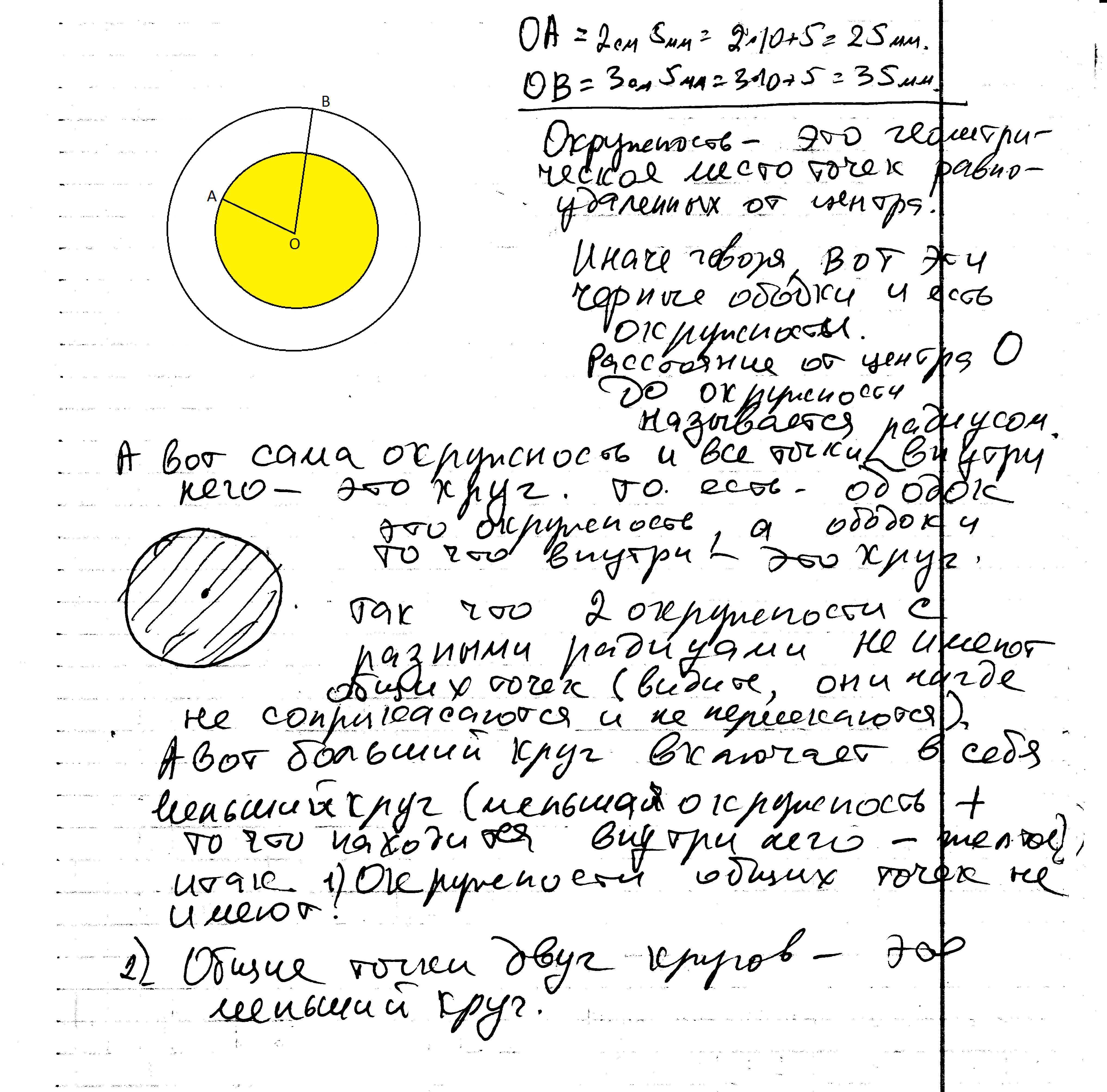 начерти две окружности, имеющие общий центр. длина радиуса одной из них равна 2 см 5 мм, а другой 3см 5 мм. имеют ли эти окружности общую часть? имеют ли круги с такими же радиусами общую часть?