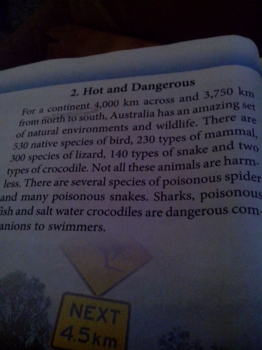 Для континента в 4000 км. поперек и 3750 км. с севера на юг, Австралия имеет удивительный набор природных сред обитания и дикой жизни. Здесь находятся 530 видом птиц,230 видов млекопитающих,300 видов ящериц,140 видов змей и 2 вида крокодилов. Не все эти животные безобидны. Есть несколько видов ядовитых пауков и много ядовитых змей. Акулы, ядовитые рыбы и крокодилы, живущие в соленой воде-опасные компаньоны для плавцов.