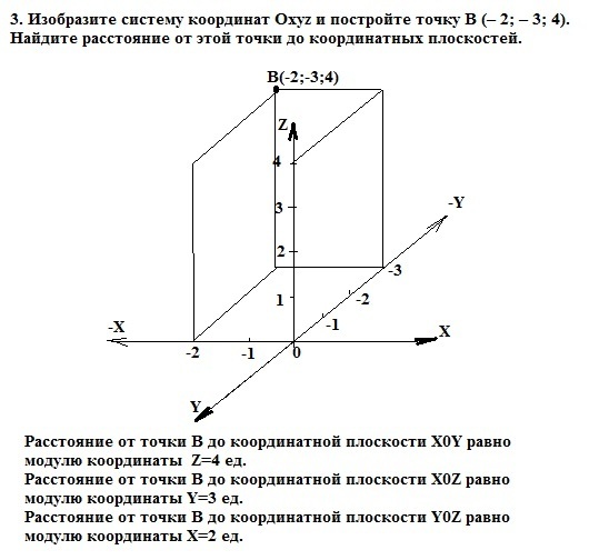3. Изобразите систему координат Oxyz и постройте точку В (– 2; – 3; 4). Найдите расстояние от этой точки до координатных плоскостей.