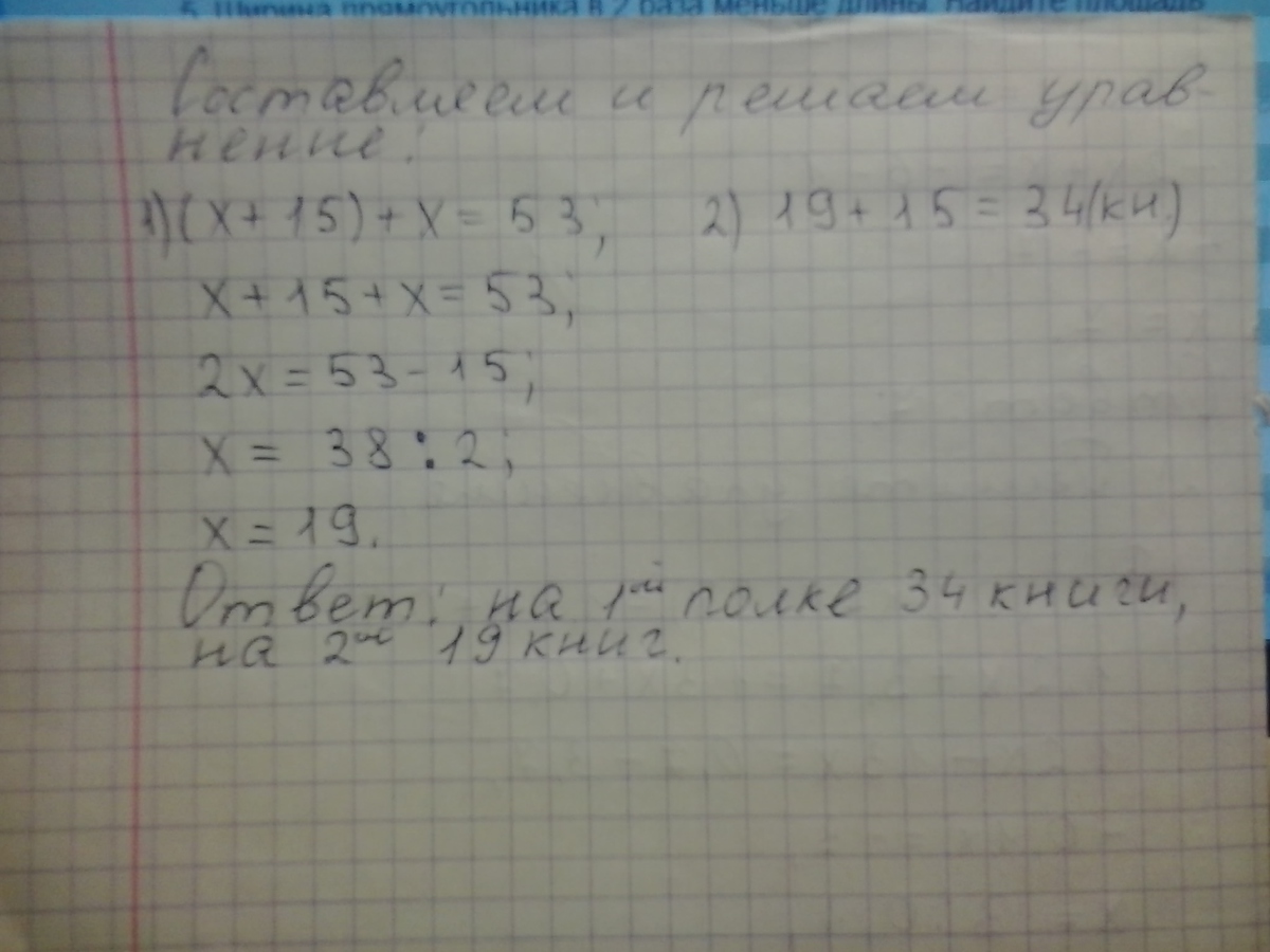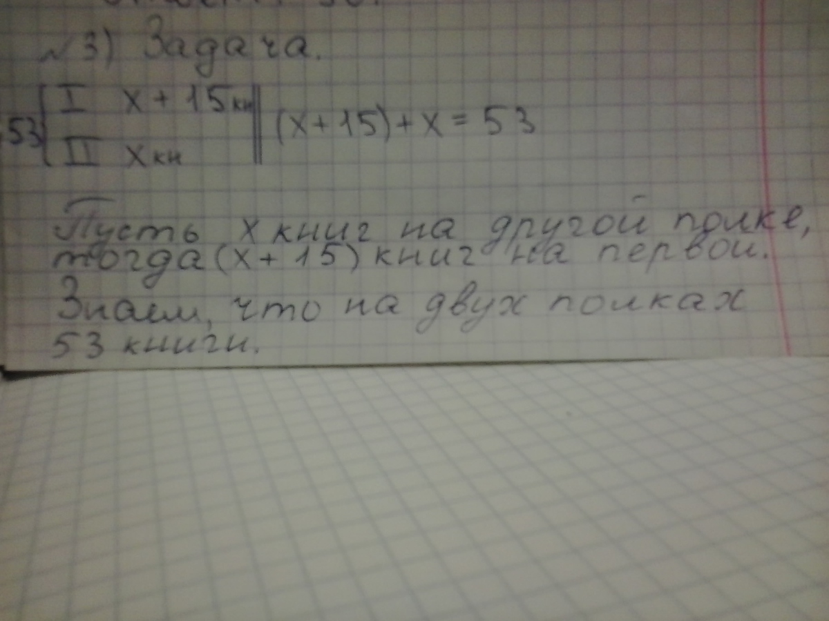 3. На одной полке на 15 книг большее, чем другой. Всего на двух полках 53 книги. Сколько книг на каждой полке?