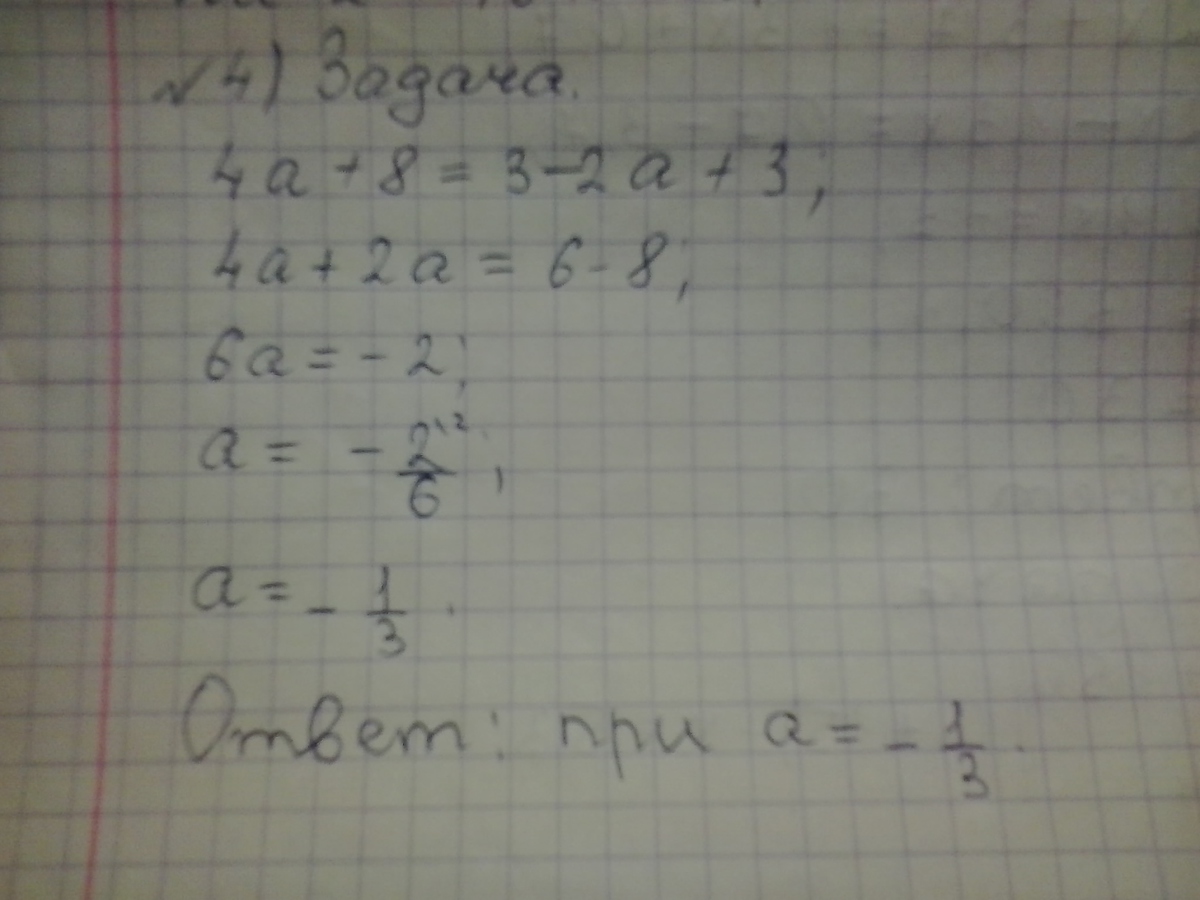 4. При каком значении переменной значение выражения 4а + 8 на 3 больше значения выражения 3 – 2а ?
