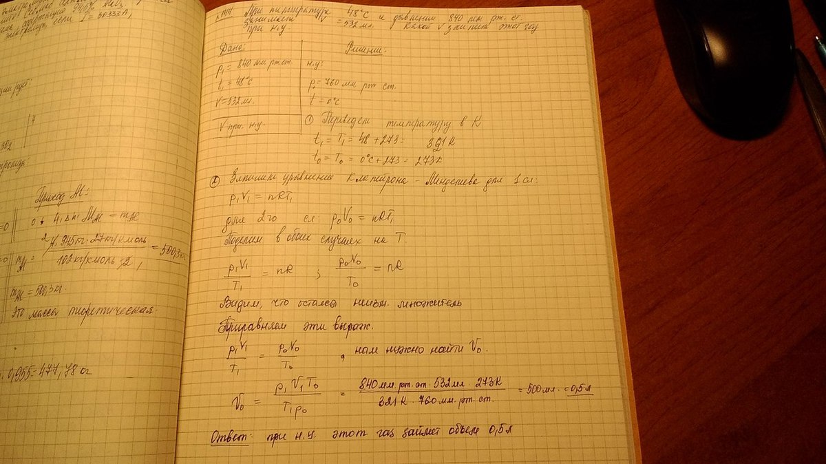 При температуре 48С и давлении 840 мм рт.ст. газ занимает объем 532 мл. Какой объем займет газ при нормальных условиях (н.у.)?