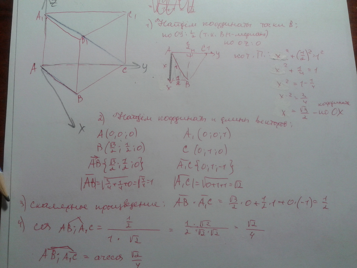 В правильной треугольной призме ABCA1B1C1 все ребра равнымежду собой.. Используя метод координат, найдите угол между прямыми А1С и АВ.