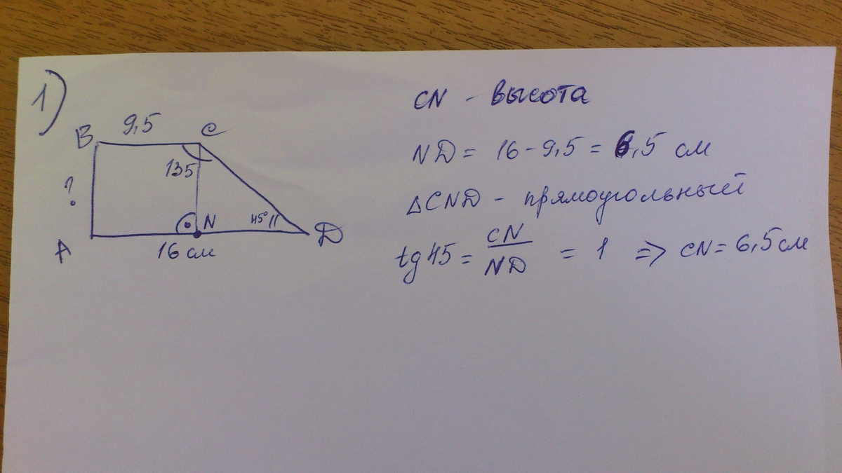 Там еще можно не через тангенс. Рассмотрим треугольник CND, он равнобедренный так как углы при основании равны (два угла по 45 градусов), тогда его стороны CN и ND тоже равны.