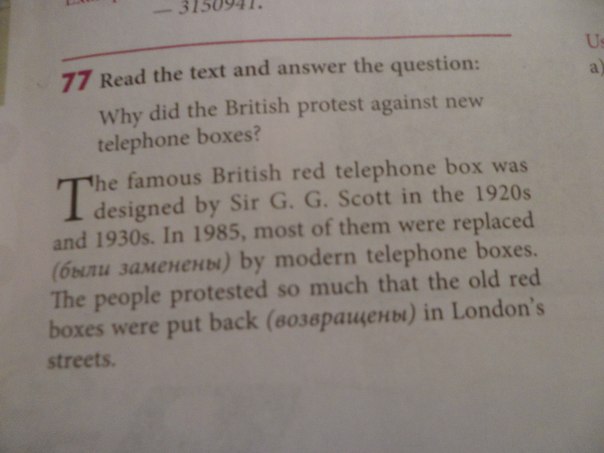 Вопрос: Why did English protest against new telephone boxes? Почему Англичане протестовали против новых телефонных будок,