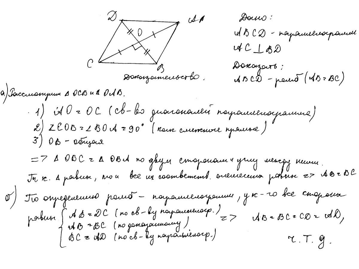 Пусть ABCD - параллелограмм, AC и BD - перпендикулярные диагонали. Нужно доказать, что ABCD - ромб (т.е. что смежные стороны параллелограмма равны).