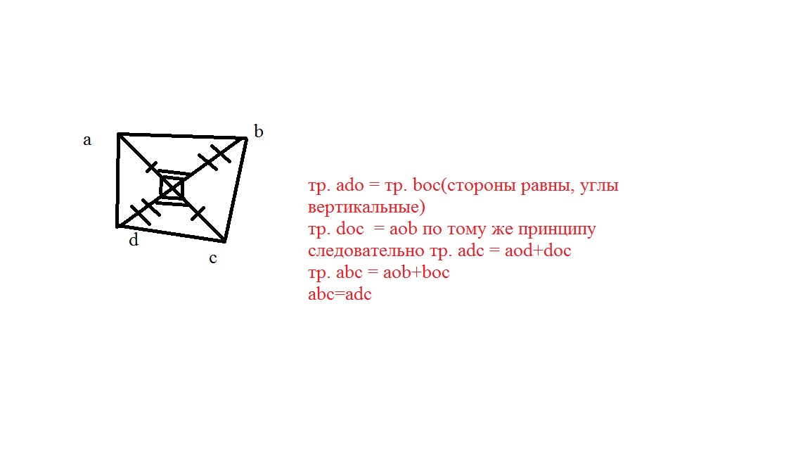 отрезки АС и ВД пересекаются точкой пересечения делятся пополам. докажите, что треугольник АВС=треугольнику СДА ПОМОГИТЕ ПЛИЗ!!!!!!!