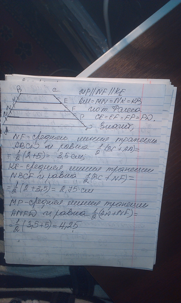 боковая сторона трапеции разделена на три равные части и из точек деления проведены к другой стороне отрезки,параллельные основаниям.Найдите длины этих отрезков,если основания трапеции равны 2м и 5м