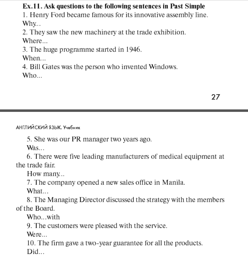 Ex. 11. Ask questions to the following sentences in Past Simple