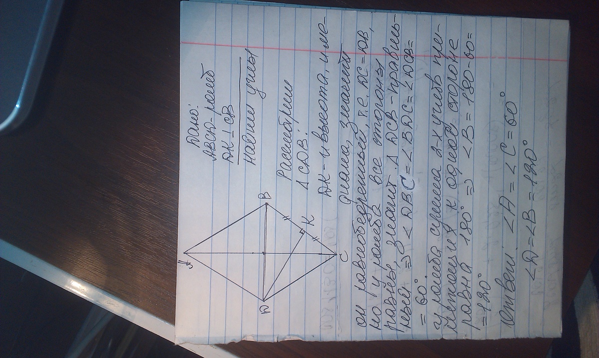 помогите пожалуйста . Мне нужно с дано и с ресунком , толь не копируйте с нета прошу !!!! Высота ромба делит его сторону пополам. Найдите углы ромба