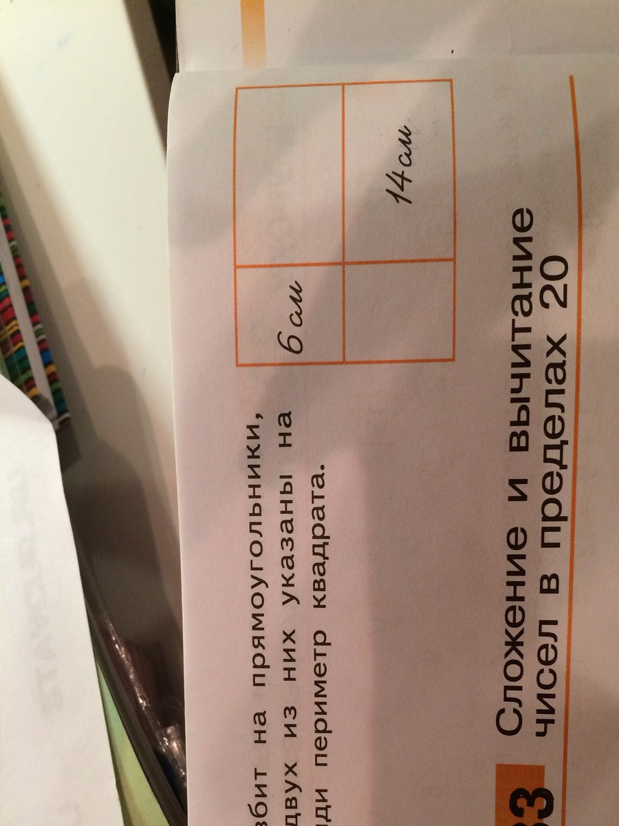 Квадрат разбит на прямоугольники, периметры двух из них указаны на рисунке. Нади периметр квадрата .