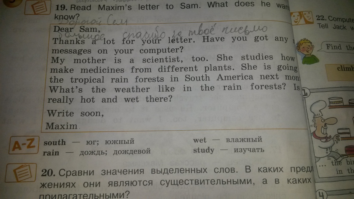 Моя мама тоже учёный. Она учит изготавливать лекарства из разных растений. Она собирается в тропические леса Южной Америки в следующем месяце.