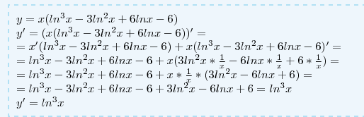 y = x(ln^3x-3ln^2x+6lnx-6) \ y'=(x(ln^3x-3ln^2x+6lnx-6))'= \ =x'(ln^3x-3ln^2x+6lnx-6)+x(ln^3x-3ln^2x+6lnx-6)'= \ =ln^3x-3ln^2x+6lnx-6+x(3ln^2x* frac{1}{x}-6lnx*frac{1}{x}+6*frac{1}{x})= \ =
