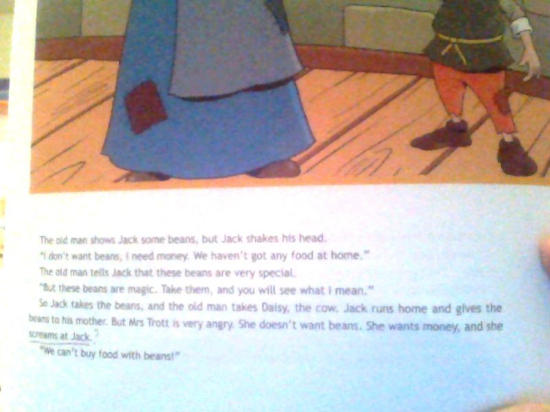 Джек побежал домой и отдал бобы своей матери. Но миссис Тротт очень разозлилась. Она не хотела бобы, ей нужны были деньги и она накричала на Джека.