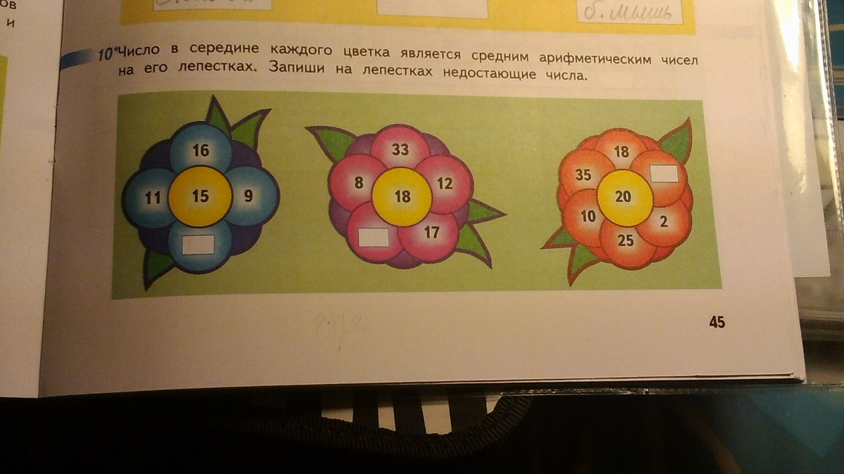 число в середине каждого цветка является средним арифметическим чисел на его лепестками. запиши на лепестками недостающие числа.