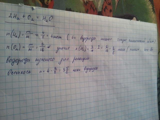 Подожгли смесь 4 г водорода и 3 г кислорода. полностью ли прореагировала эта смесь? Если нет, то какой газ и в каком колличестве остался после взрыва?