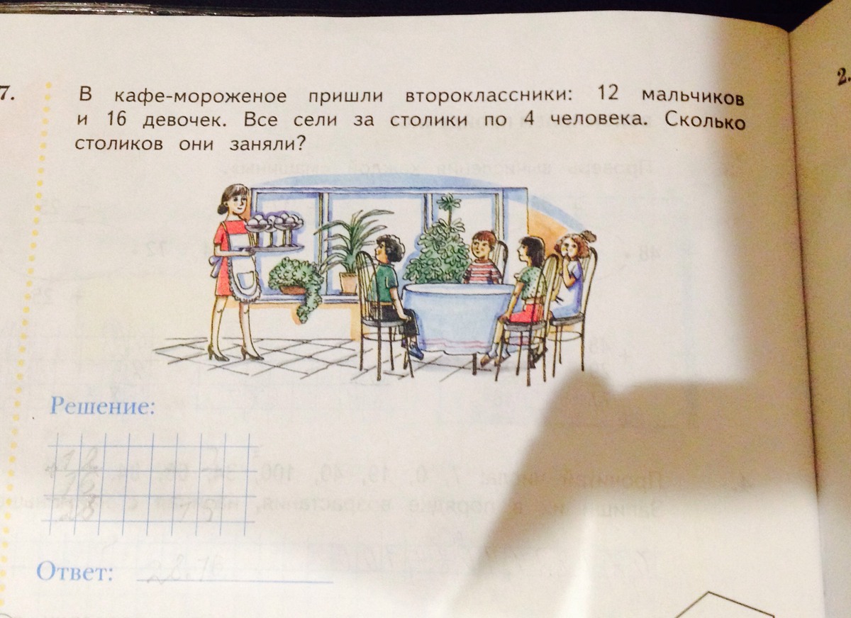 1) 16+12=28 (чел.) всего детей 2)28/4=7 столиков