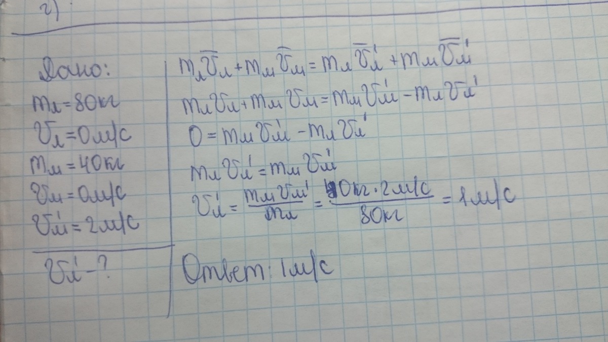 Из неподвижной лодки, масса которой 80 кг, прыгает на берег мальчик.Масса мальчика 40 кг, скорость его при прыжке 2м/с. Какую скорость приобрела лодка?но мы еще не проходили в 7 классе ипульс тела,а я не знаю как офрмить задачу по физике с дано и решением!С уважением Ионов Дмитрий!Умоляю