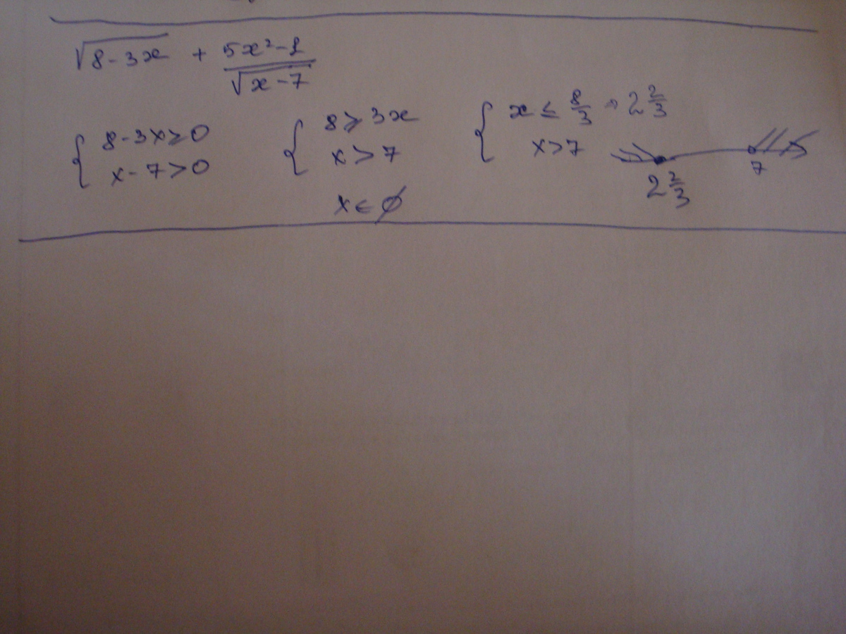 При каких значениях x определено значение выражения √(8-3x) + (5x^2 - 1) / √(х-7)