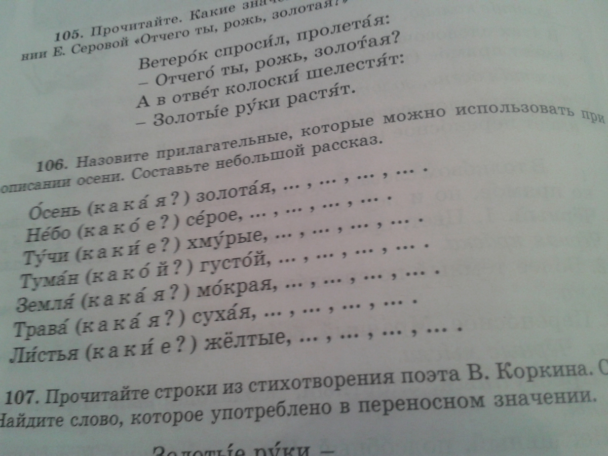 осень, золотая, хмурая, теплая, дождливая, холодная, снежная. Небо серое, мрачное, хмурое, пасмурное, серое. Тучи хмурые, тяжелые, кучевые. Туман густой, стелющийся, мрачный. Земля мокрая, слякотная, промерзлая.Трава сухая, пожухлая, серая. Листья желтые, сухие, ломкие, разноцветные.