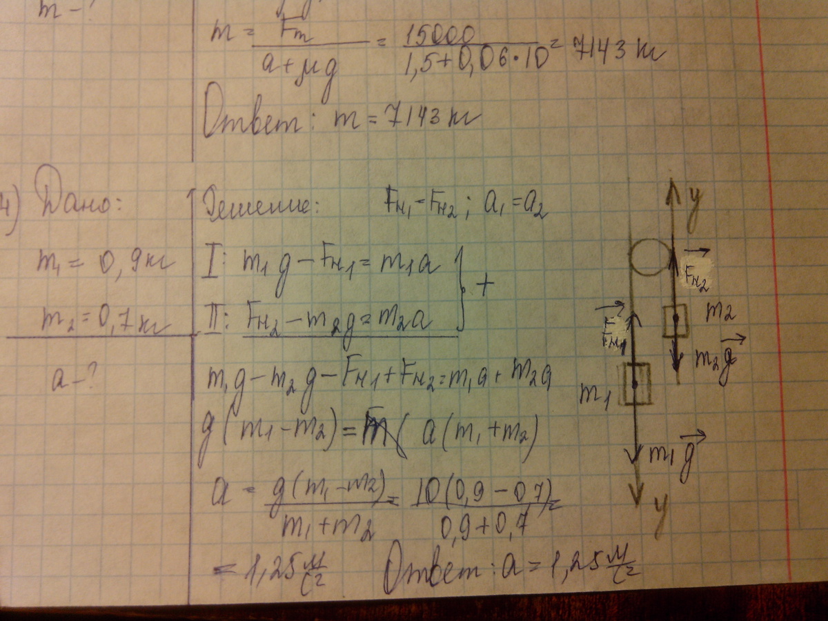 На невесомой и нерастяжимой нити, перекинутой через неподвижный блок, подвешены грузы массами m1 = 0,9 кг и m2 = 0,7 кг. С каким ускорением движутся грузы?