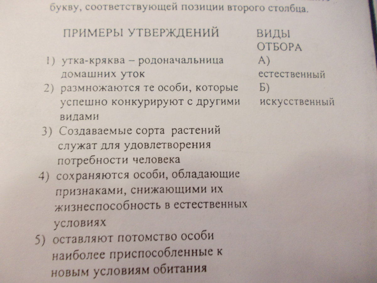 Установите соответствие между утверждением и видом отбора, который его иллюстрирует.